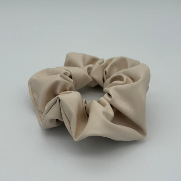 A soft faux-leather scrunchie in a versatile neutral tone. Chic, durable, and perfect for elevating ponytails or buns.